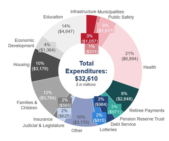 The General Fund budget does not include special revenue funds, which are comprised of revenue the government generates from fees and services dedicated to particular uses, or federal funds. Including special revenue and federal funds, the consolidated Commonwealth budget for fiscal year 2026 totals $32.6 billion.