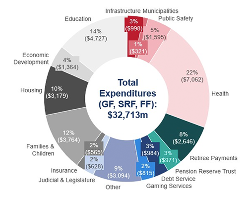 More than 60% of total government funding is allocated to health, education, public safety, housing, and retirees. The fiscal year 2026 general fund budget increases total spending by 1.5% from the previous fiscal year, excluding certain reclassifications of general fund revenues as special revenue. Additional funding includes support the Department of Education’s special education program, and to fund the share of the salaries of fire fighters, emergency medical professionals, and correctional officers that were previously paid by expiring COVID-19 related stimulus funds by the U.S. Government.
